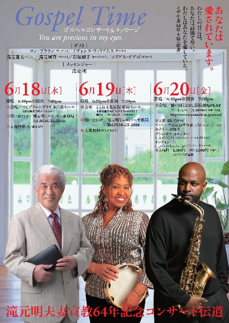午後7時から、設楽町津具村のつぐグリーンプラザにて、滝元明ミニストリーが開催されます。